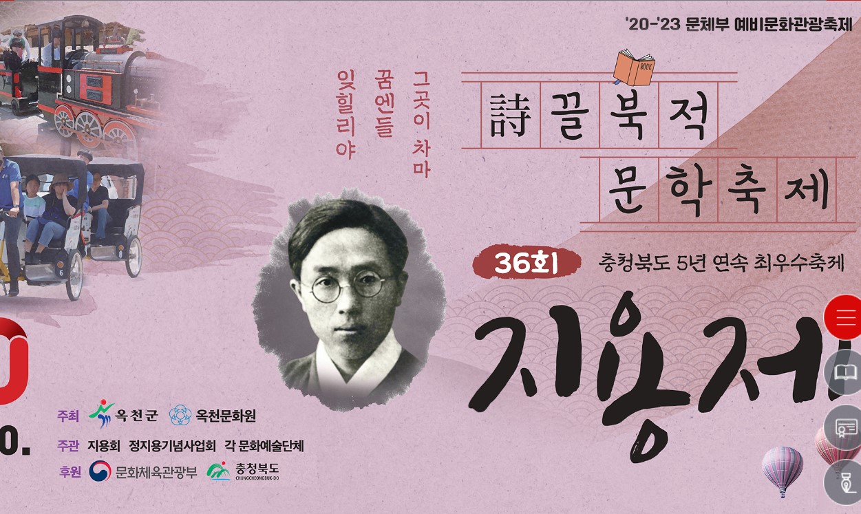 지용제는 한국 현대시의 선구자이며 우리의 언어를 시적 형상화한 시인이자 우리민족의 정서를 가장 잘 표현한 시인 정지용을 추모하고, 그의 시문학 정신을 이어가며 더욱 발전시키자는 뜻으로 '시인 정지용의 고향 옥천의 문학축제' 입니다. 제35회 정지용문학상 시상식 및 시노래 콘서트, 골목투어, 생가 버스킹, 인력거, 새빨간 기관차, 모던의상실, 추억의 놀이터, 희망종이배 띄우기, 지용을만나는길 행사와 함께 정지용 박물관, 지역문화예술인 전시회 등 이 있습니다,.
